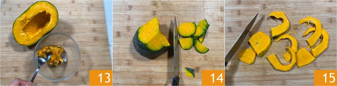 Verwijder de zaden en de draderige binnenkant 13, schil de pompoen 14 en snijd het vruchtvlees in plakken van ongeveer 2 centimeter 15.