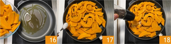 Doe de pompoen in een pan met een scheutje hete olie 16 en breng op smaak met zout 17 en peper 18.