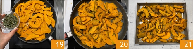 Geef smaak met fijngehakte tijm, salie en rozemarijn 19 en bak op middelhoog vuur 10 minuten, voeg indien nodig wat water toe 20; de pompoen hoeft niet helemaal gaar te zijn. Na het koken leg je de pompoen op een bakplaat om iets af te laten koelen 21.