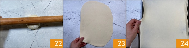 Haal het deeg uit de koelkast en rol met een deegroller de portie van 350 g uit 22 tot een lap ter grootte van de bakplaat 23: wij gebruikten een bakplaat van 40x30 cm. Als het deeg terugkrimpt, laat het dan nog 5 minuten rusten. Leg de lap in de bakplaat en trek hem voorzichtig zodat ook de randen bedekt zijn 24.
