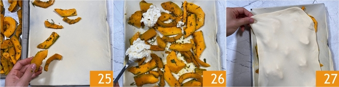 Verdeel de lauwe pompoen over de bodem van de focaccia 25 en schep vervolgens lepels stracchino erbij 26. Rol de portie van 300 g op dezelfde manier uit en gebruik die lap om de focaccia te bedekken 27.