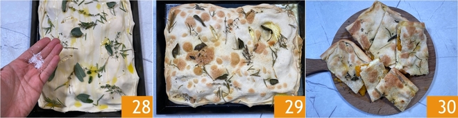 Breng de bovenkant op smaak met de aromatische kruiden, een scheutje olie en vlokjes zeezout 28. Maak tenslotte een paar inkepingen in het bovenste deeg zodat het tijdens het bakken niet te veel opbolt. Bak in een voorverwarmde oven op onder- en bovenwarmte op 250° gedurende 15 minuten, zet daarna op hetelucht en bak nog 5 minuten verder 29. Zodra hij goudbruin is, haal je de focaccia uit de oven 29 en laat je hem iets afkoelen voordat je hem in plakken snijdt. Je krokante focaccia met pompoen en kaas is klaar om te proeven 30!