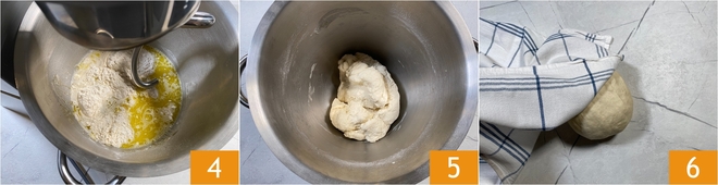 Zet de keukenmachine met de deeghaak op gemiddelde snelheid 4 en kneed tot het deeg zich om de haak wikkelt en goed samenhangt 5. Laat het deeg 20 minuten rusten op kamertemperatuur, afgedekt met een theedoek 6.