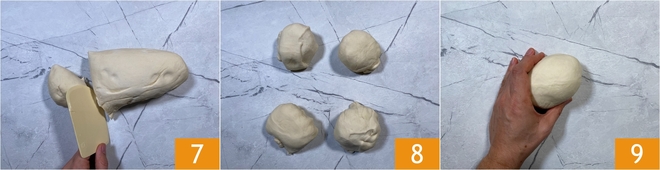 Na de rusttijd pak je het deeg en verdeel je het met behulp van een deegschraper 7: je moet 2 porties van 350 g (voor de bodem) en 2 bolletjes van 300 g (voor de bovenkant) krijgen 8. Bol elk bolletje op het werkblad 9.