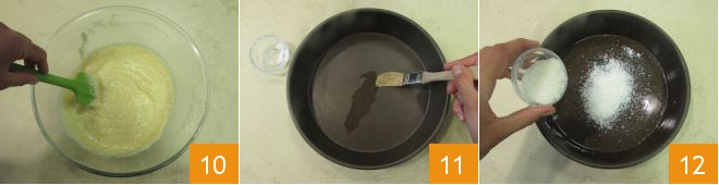 Als je een glad en klontvrij mengsel hebt 10, vet je een bakvorm in met een bodem van 20 cm en een bovenkant van 22 cm 11 en bestuif je deze met geraspte kokos 12.