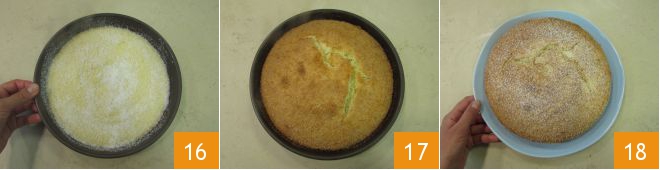 Bak het gebak 16 in een voorverwarmde heteluchtoven op 180 B0 gedurende 40 minuten op het middelste rek. Haal na het bakken je kokostaart uit de oven 14 en zodra hij is afgekoeld, stort je hem op een serveerschaal en garneer je met poedersuiker 15.