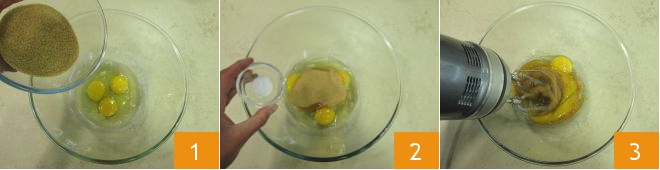 Om de kokostaart te maken klop je de hele eieren in een kom, voeg je de rietsuiker 1 en het zout 2 toe en klop je het mengsel met een handmixer 3.