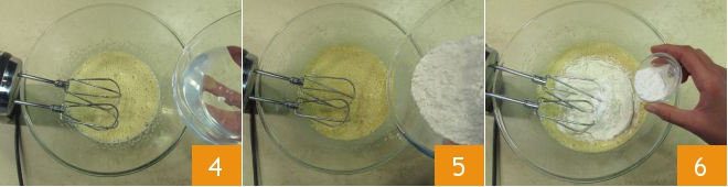 Zodra je een egaal en licht mengsel hebt, giet je de kokosolie erbij 4. Blijf met de mixer kloppen en voeg vervolgens beetje bij beetje de gezeefde bloem 5 en het bakpoeder 6 toe.