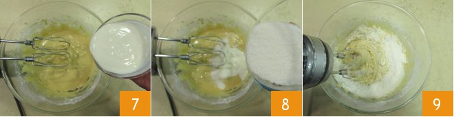 Na nog een korte mixbeurt om de droge ingrediënten op te nemen, voeg je de yoghurt 7 en de geraspte kokos 8 toe. Meng opnieuw met de handmixer 9.