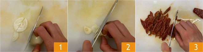 Om gestoofd konijn met olijven en zongedroogde tomaten te bereiden, giet je eerst de zongedroogde tomaten goed af van de olie en bereid je de Groentebouillon volgens ons recept. Snijd zowel de ui 1 als de knoflook 2 in plakjes. Snijd de zongedroogde tomaten in reepjes 3.