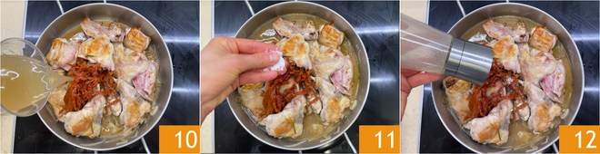 Giet de bouillon in de pan 10, breng op smaak met zout 11 en peper 12.