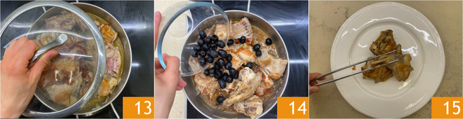Roer, dek af met deksel 13 en laat op laag vuur circa 40 minuten zachtjes koken of tot het konijn zacht is; indien nodig kun je tijdens het koken extra bouillon toevoegen. Voeg in de laatste 5 minuten van de gaartijd de olijven toe 14 en roer nog een keer. Schik op borden 15.