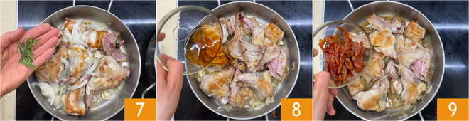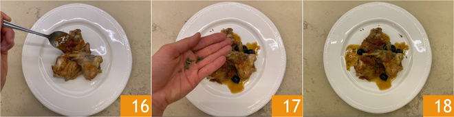 Werk af met wat van de braadjus 16 en wat fijngesneden rozemarijn 17. Gestoofd konijn met zongedroogde tomaten is klaar om warm geserveerd te worden 18.