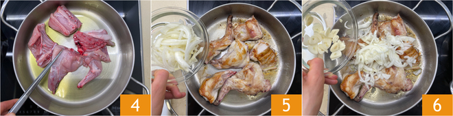 Verwarm in een pan de olie en voeg het konijn toe 4 en bak het op middelhoog vuur aan alle kanten goudbruin, dit duurt ongeveer 5-10 minuten. Voeg daarna de ui 5 en de knoflook 6 toe.