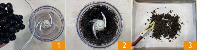 Om de koude zomerse orecchiette te maken begin je met het olijvencrumble: doe de ontpitte zwarte olijven in een mixer 1 en maal ze fijn 8. Verdeel de fijngemalen olijven over een bakplaat bekleed met bakpapier 3 en bak in een voorverwarmde heteluchtoven op 230° gedurende 15 minuten.
