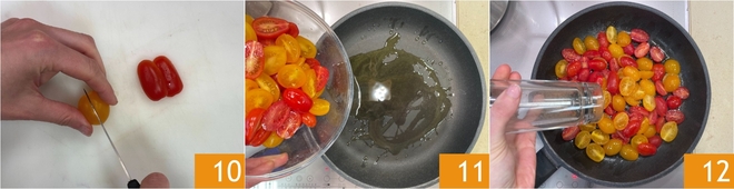Nu de kerstomaatjes: halveer de datterini 10, doe ze vervolgens in een reeds hete anti-aanbakpan met een flinke scheut olie 11. Breng op smaak met zout en peper 12.