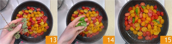 Voeg ook de gedroogde oregano 13 en de basilicum 14 toe. Bak op hoog vuur een paar minuten 15, zet dan het vuur uit en zet apart.