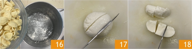 Breng een pan met gezouten water aan de kook en kook de orecchiette volgens de aanwijzingen op de verpakking 16. Snijd intussen de mozzarella in blokjes van ongeveer 3 cm 17 18.