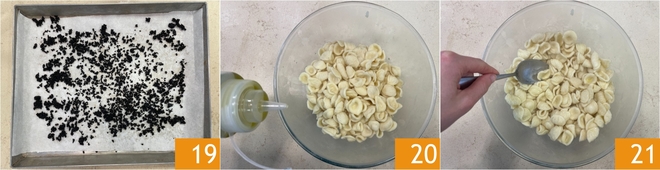 Het olijvencrumble is dan ook klaar; haal uit de oven en laat iets afkoelen 19. Giet de orecchiette af in een ruime kom, breng op smaak met een scheut olie 20 en roer zodat ze niet aan elkaar plakken 21.