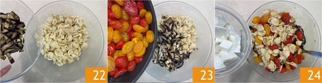 Laat een paar minuten afkoelen, voeg dan de gegrilde aubergines 22, de in de pan gebakken tomaatjes 23 en de mozzarella 24 toe.