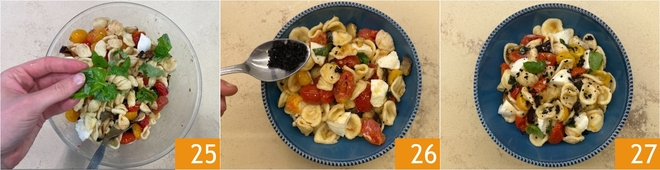 Geef extra geur met een paar blaadjes basilicum 25 en meng voorzichtig, schep daarna op de borden. Garneer met een royale handvol olijvencrumble 26 en serveer je koude zomerse orecchiette 27!