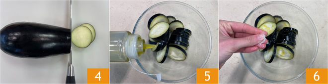 Ga verder met de aubergines: snijd ze in plakken van ongeveer 1 cm dik 4, doe ze in een kom en breng op smaak met olie 5 en zout 6. Meng met je handen zodat ze gelijkmatig gekruid worden.