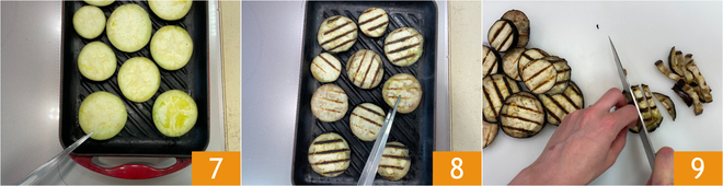 Leg de aubergineplakken op een goed hete grill 7 en gril ze aan beide kanten 8. Zodra ze gaar zijn, snijd je ze in reepjes 9 en zet je ze apart.