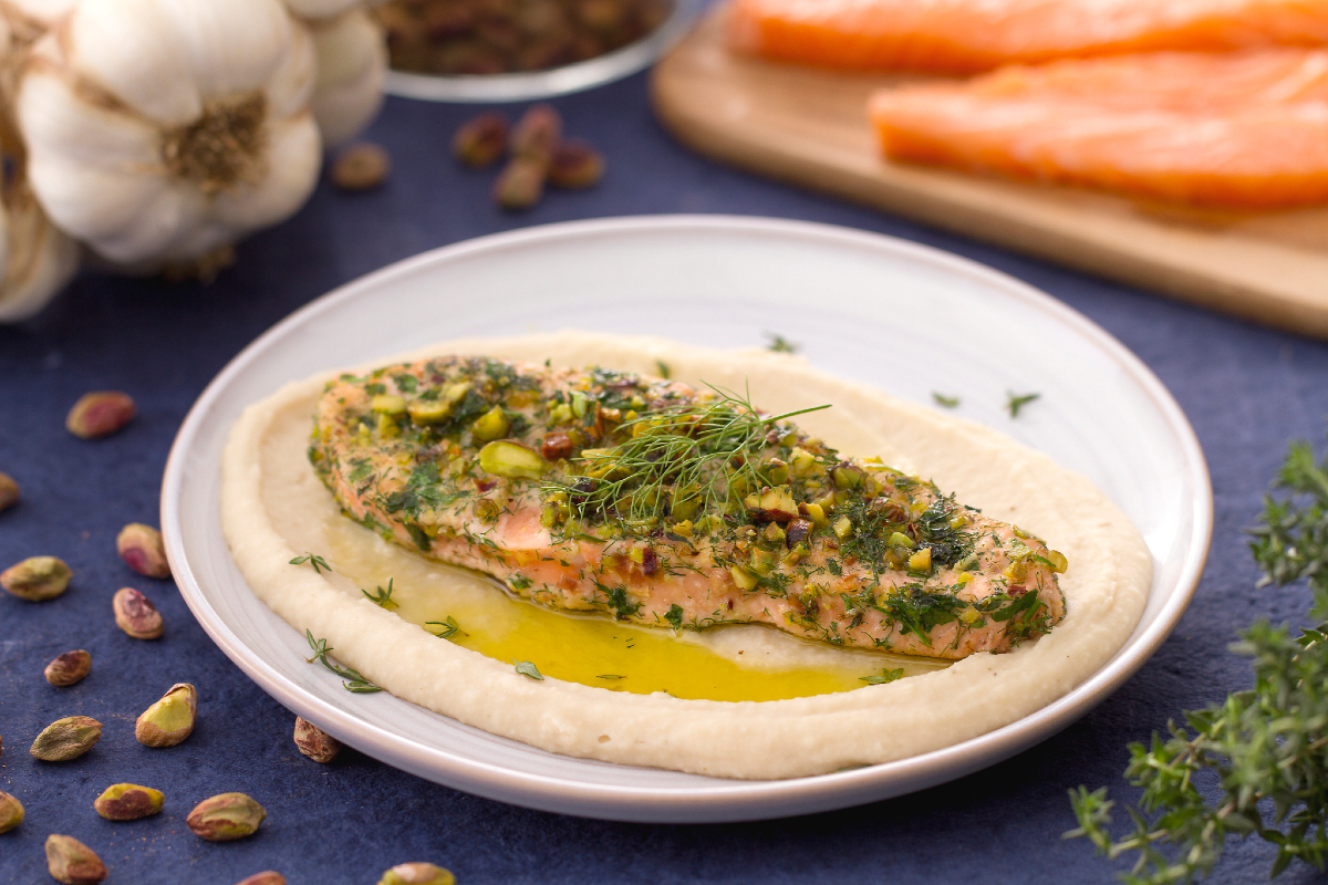 Knapperige zalm op cannellinipuree is een hoofdgerecht dat een onweerstaanbare mix van smaken en aroma's verenigt. Het bijzondere van dit recept begint al bij het snijden van de zalm: door hem in het midden in te snijden en als een boek open te vouwen ontstaan er "zalmvlinders", ideaal om te grillen of in de pan te bakken dankzij hun gemiddelde dikte, die zorgt voor een gelijkmatige en snelle garing zonder aanbrandrisico. De zalmvlinders van Noorse zalm worden daarna bedekt met een paneerlaag van fijngehakte kruiden en pistachenoten. Samen vormen ze een krokant en geurig jasje dat prachtig combineert met de romige structuur en de delicate, aromatische smaak van de cannellinipuree, op smaak gebracht met salie en rozemarijn. De zachte structuur van cannellinibonen leent zich uitstekend voor crèmes en soepen, maar ook voor smakelijke Balletjes van cannellinibonen. Voor dit recept hoeft de zalm slechts een paar minuten op de grill gekleurd te worden, zodat het vlees zacht en sappig blijft, en je kunt het serveren op een bedje van puree voor een echt origineel en smakelijk gerecht. Maak knapperige zalm op cannellinipuree en zet een indrukwekkend gerecht op tafel dat eenvoudig en snel te bereiden is!