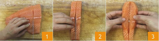 Om de knapperige zalm op cannellinipuree te bereiden, begin je met het verwijderen van de graatjes uit het zalmfilet: gebruik een pincet en verwijder de graatjes langs de rug; voel daarna met je vingers of er geen graatjes meer aanwezig zijn. Maak vervolgens de snede voor de vlinder: snijd het filet in 4 plakken van ongeveer drie vingers breed 1 en snijd elke plak halverwege in, zonder helemaal door te snijden 2; vouw daarna de plakken als een boek open 3, leg ze op een schaal en zet ze opzij. Deze snijtechniek kan ook toegepast worden als je een zalmfilet met vel hebt.