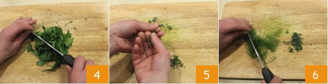 Bereid nu de kruiden die je nodig hebt om de zalmvlinders te bedekken: hak een bosje peterselie fijn 4, 2 takjes tijm 5 en 2 takjes dille 6.