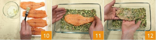 Besmeer het hele oppervlak van elke zalmvlinder met het eiwit 10, leg ze daarna in de ovenschaal met de paneerlaag en keer ze aan beide kanten zodat ze volledig bedekt worden (11-12). Leg de bedekte zalmvlinders op een schaal en zet ze even apart.
