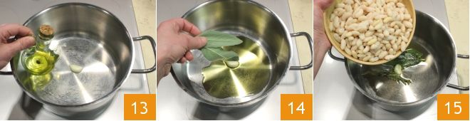 Ga verder met de cannellinipuree: neem een ruime pan en verwarm een teentje knoflook en een scheutje extra vergine olijfolie 13, voeg dan de salie 14 en de rozemarijn toe en laat een paar minuten zachtjes fruiten (als je wilt kun je de knoflook verwijderen nadat de olie op smaak is gebracht), voeg vervolgens de eerder geweekte en gekookte cannellinibonen toe 15.