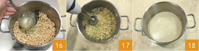 Besprenkel met een paar pollepels groentebouillon 16, breng op smaak met zout en peper en laat een paar minuten koken, tot de bonen romig en redelijk droog zijn. Raadpleeg onze Kookschool voor tips over hoe je dit het beste bereidt: Groentebouillon. Haal de pan nu van het vuur en pureer het mengsel met een staafmixer 17 direct in de pan, tot je een gladde en dikke crème hebt verkregen 18.