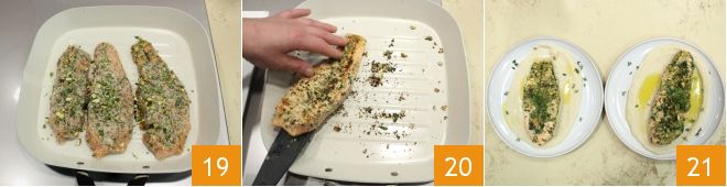Bak nu de zalmvlinders: verhit een grill of een brede koekenpan goed, dit is een belangrijke stap omdat slechts enkele minuten bakken op hoog vuur genoeg zijn om het vlees zacht te houden; je kunt ze ook op een iets lager vuur bakken, maar let erop dat het vlees niet te droog wordt. Je kunt ze ook in de pan bakken met een scheutje olie. Bak aan beide kanten op matig vuur tot de buitenkant kleur krijgt (19-20) en van buiten mooi sappig blijft. Nu nog opmaken: leg een bedje van cannellinipuree op het serveerbord en leg de zalmvlinder erop, werk af met een takje dille, een snufje tijm en een scheutje rauwe olijfolie 21. Serveer je knapperige zalm op cannellinipuree en eet het goed warm!