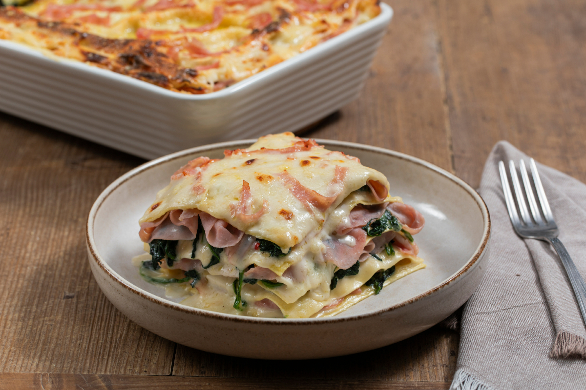 Lasagne opnieuw interpreteren is nooit makkelijk, maar vandaag willen we je verrassen met onze lasagne met prosciutto en spinazie! Een witte variant die opvalt door zijn romigheid en de rijke smaakbalans, dankzij de royale hoeveelheid béchamelsaus en de bijzondere toets die alleen gekookte ham kan geven. En om deze lasagne nog smaakvoller te maken hebben we spinazie toegevoegd die kort in de pan is gebakken met knoflook en chili... Door deze groente te vervangen door andere seizoensingrediënten kun je elke keer een nieuw recept maken om je gasten te verrassen! De lasagne met ham en spinazie biedt niet alleen een smakelijk alternatief voor wie wil afwisselen van de klassieke Bolognese saus, maar is ook een eerste gang die ideaal is voor familiediners, speciale gelegenheden of gewoon wanneer je jezelf wilt verwennen met iets heerlijk troostends en bevredigends. Ontdek met ons hoe je het klaarmaakt!