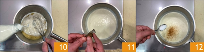 Giet vervolgens de koude melk al roerend in een dunne straal 10 tot de saus is ingedikt. Voeg royaal geraspte nootmuskaat toe 11 en een snufje zout 12.