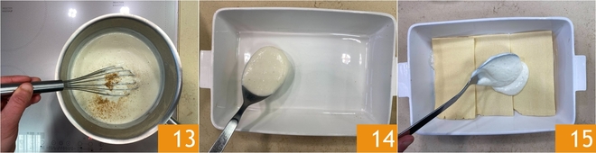 Roer goed 13 en haal de béchamelsaus van het vuur. Stel nu de lasagne samen in een grote ovenschaal van 30x20 cm: verdeel wat béchamelsaus over de bodem 14, leg vervolgens 3 eierpastavellen neer en bedek met meer béchamelsaus 15.