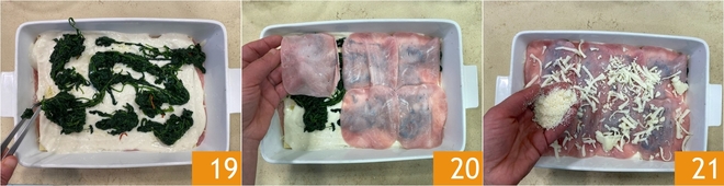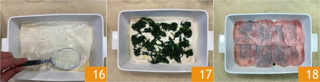 Verdeel die goed met de achterkant van een lepel 16, voeg dan de spinazie toe 17 en leg de plakken gekookte ham erop 18. Voeg een beetje mozzarella en geraspte Parmezaanse kaas toe 18.