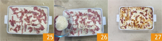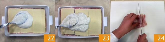 Blijf de ingrediënten op deze manier afwisselen tot je 5 lagen hebt. De bovenste laag moet bestaan uit pastavellen en een royale hoeveelheid béchamelsaus 23. Verdeel die goed met de achterkant van de lepel. Snijd de overgebleven gekookte ham in reepjes 24.