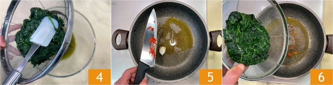 Breng ze over in een vergiet om het overtollige vocht te verwijderen 4. Bak in dezelfde pan olie, knoflook en chilipeper 5, voeg dan de spinazie toe 6.