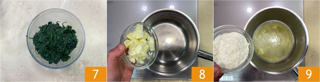 Bak ze een paar minuten zodat ze smaak krijgen, zet ze daarna in een kom 7. Ga verder met de béchamelsaus: doe in een steelpannetje de boter 8 en laat die smelten, voeg dan de bloem toe 9 en roer snel.
