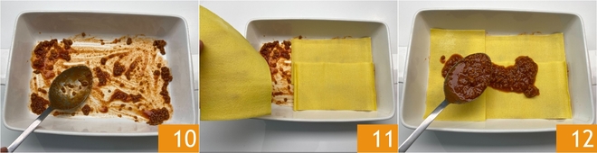 Als de ragù klaar is, kun je de lasagne opbouwen: neem een ovenschaal van 20x30 cm en verdeel een laag ragù over de bodem 10, leg er vervolgens 3 lasagnevellen op 11 en bedek met ragù 12.