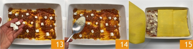 Verdeel wat mozzarellablokjes 13 en geraspte Parmigiano Reggiano DOP 14, maak dan nog een lasagnelaag 15 en ga zo door met het afwisselen van de ingrediënten in deze volgorde totdat je in totaal 4 lagen hebt.