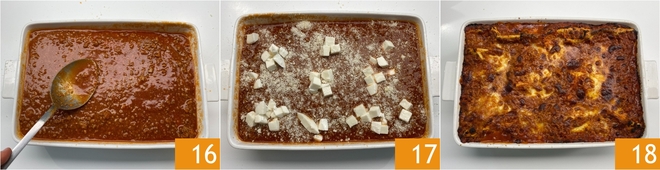 Sluit af met een royale laag ragù 16, mozzarella en geraspte kaas 17. Bak in een voorverwarmde oven (boven- en onderwarmte) op 200°C gedurende ongeveer 20 minuten, zet dan de grillfunctie aan en bak nog eens 10 minuten. Haal uit de oven en laat een paar minuten rusten voordat je de lasagne zonder béchamelsaus serveert 18!