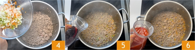 Zet het vuur lager en voeg het fijngesneden groentemengsel toe 4. Laat het soffritto een paar minuten zacht worden, zet het vuur vervolgens weer hoger en blus af met de rode wijn 5. Als de alcohol volledig is verdampt, voeg je de passata van tomaat toe 6.