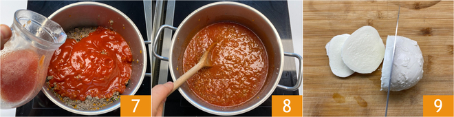Voeg ook een beetje water toe (net genoeg om de maatbeker te spoelen) 7, breng op smaak met zout en laat 45 minuten op laag vuur sudderen 8; aan het einde moet je een vrij vloeibare ragù hebben. Snijd ondertussen de mozzarella in blokjes 9.