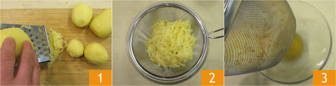 Om de latkes te bereiden, schil je de aardappelen en rasp je ze met een grove rasp 1. Doe de geraspte aardappelen in een vergiet boven een kom en laat ze 10-15 minuten rusten 2: op deze manier verliezen ze het vocht en worden ze niet zwart 3.