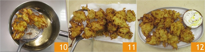 Bak ze in totaal 3-4 minuten, draai de pannenkoekjes aan beide kanten 10. Wanneer ze mooi goudbruin zijn, laat ze uitlekken op keukenpapier 11. Je latkes zijn klaar om nog warm te serveren, vergezeld van zure room met dille 12!