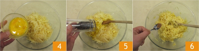 Doe de aardappelen in een kom en voeg het ei 4, het zout, de peper 5 en de nootmuskaat 6 toe.
