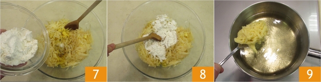 Voeg tenslotte de bloem toe 7 en meng alles met een lepel 8. Giet twee vingers extra vergine olijfolie in een pan en verwarm deze tot een temperatuur van 170°, voeg daarna per keer een paar lepels van het beslag toe 9.